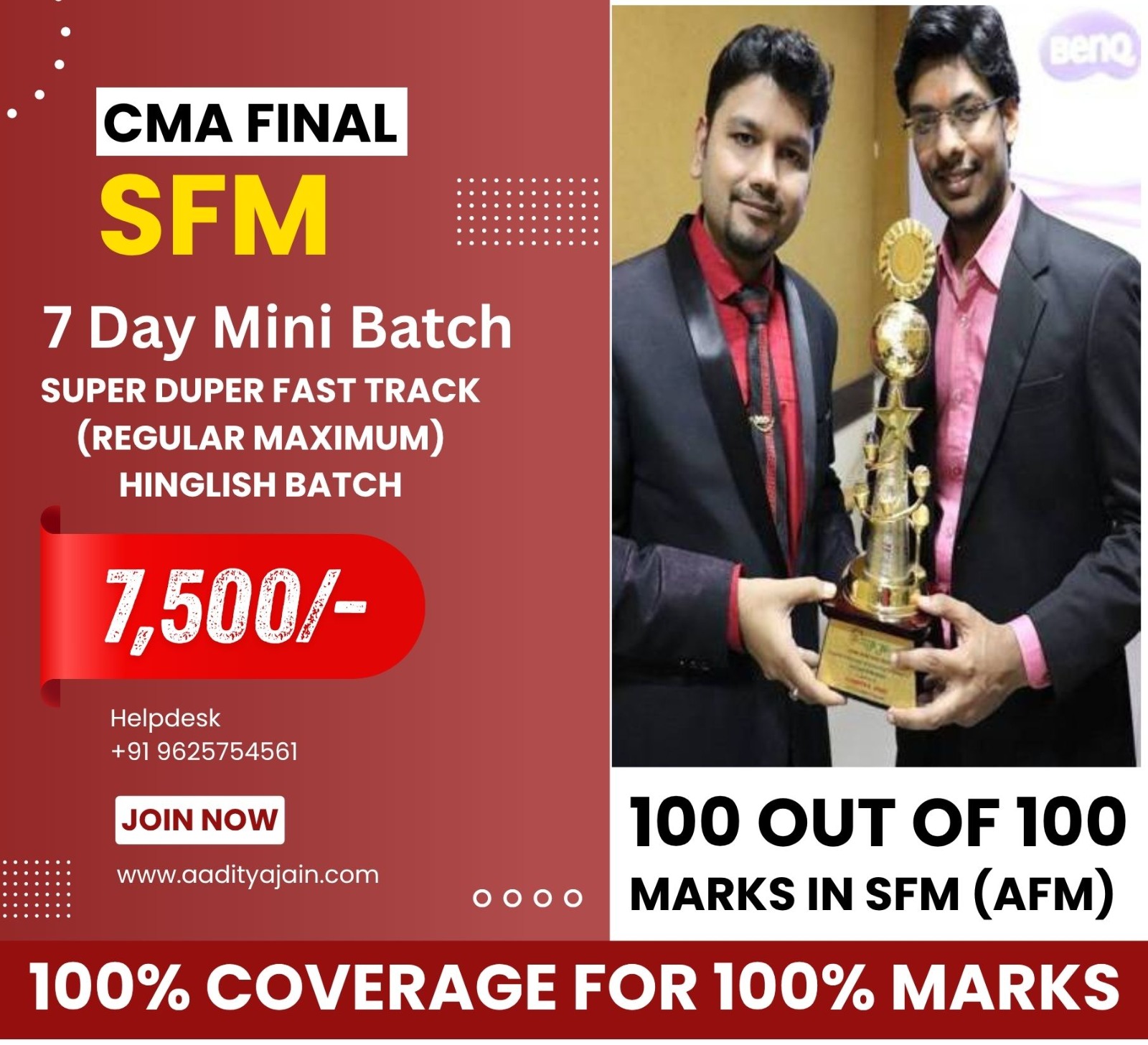 Aaditya Jain sir is the best teacher for CMA Final SFM.Highly recommended If you are intended to clear in first attempt. Many of his past students are all India rank holders.His conceptual clarity and practical knowledge is wonderful.